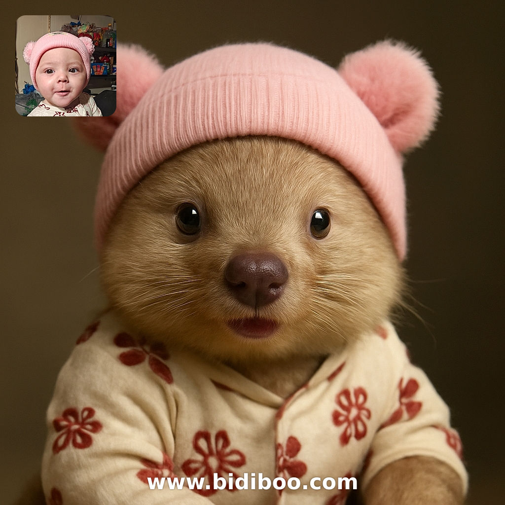 • An adorable baby bundled up in a fluffy grey onesie and a white hat with blue pom-poms and the name 'Kylan' embroidered on it, being held by a person partially visible in the frame. The baby looks curiously at the camera, clutching a small plush toy, with a cozy indoor setting in the background.