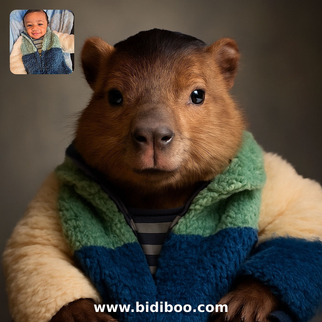 • A peaceful baby bundled up in a cozy hat and patterned pajamas, staring curiously into the camera with sleepy eyes, surrounded by soft blankets and a calm atmosphere.