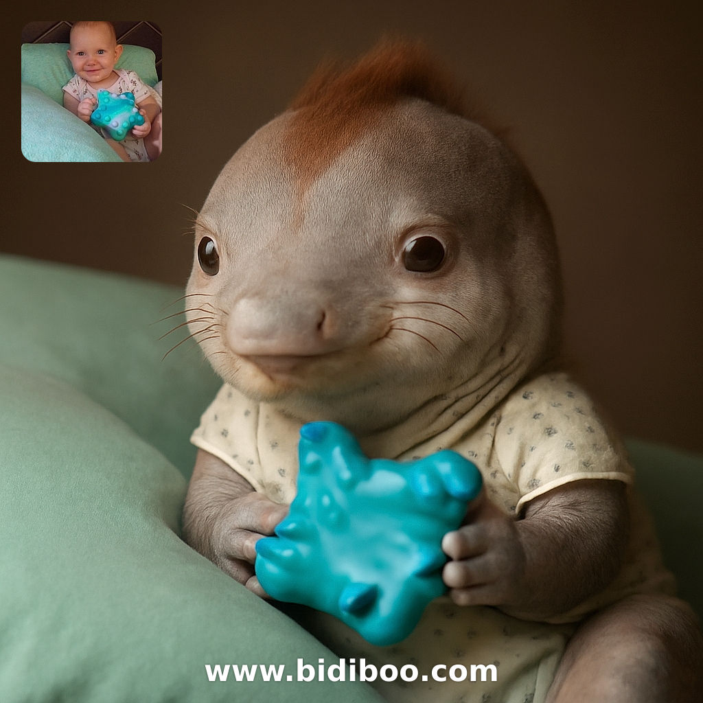 • A tiny baby nestled comfortably in a colorful cushioned baby seat, sucking on a pacifier, dressed in a cozy animal-patterned onesie with soft socks, surrounded by playful pastel patterns and a hint of warning labels on the side.