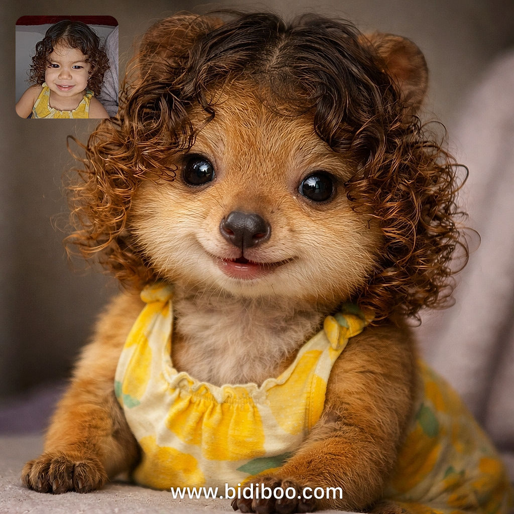 • A wide‑eyed baby in a sunny yellow dress and matching headband stares up like a tiny sunflower inspector — surrounded by plush clouds and daisy prints, the scene is soft, bright and irresistibly squishable.