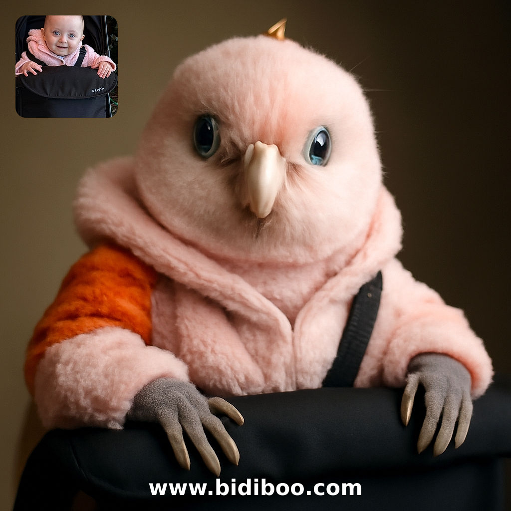 • A cheerful baby with sparkling blue eyes and a tiny topknot is bundled up in a cozy pink jacket, peeking out from a black stroller labeled 'ORIGIN,' with a curious smile that could melt hearts.
